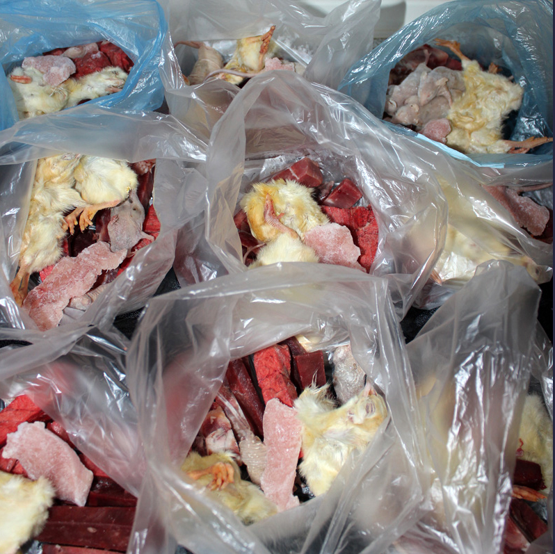 De verhoudingen die volgens de NRV beginselen worden aangehouden bij het zelf samenstellen zijn: 15% bot, 3-5% lever, 3% nier, 10% hart en 70-77% spiervlees. Deze percentages zijn afgeleid van hoe een heel prooidier qua verhoudingen in elkaar zit. - Bied minimaal 5 diersoorten per week aan om compleet te voeren.