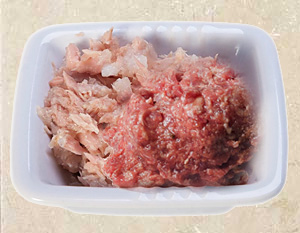 Begin daarom bij katten die geen rauw vlees gewend zijn met kleine porties te mengen met een goede kwaliteit blikvoer zoals Feline Porta 21, Cosma of Animonda Carny. - Rauw varkensvlees is gevaarlijk voor katten