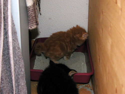 Want wat bleek vandaag, de twee rode heren zijn dames!De eerste dag twijfelde ik al eventjes, maar ik was moe en dacht het niet goed te zien. Maar vandaag bij een meer nauwkeurige inspectie van de kontjes viel me op dat de achterkantjes van de rode kittens toch echt hetzelfde eruit zagen als die van de torties (op de kleur na natuurlijk). Voor de zekerheid heb ik er wat foto's van gemaakt die ik jullie zal besparen, en aan wat collegafokkers voorgelegd. Hun oordeel was unaniem: de rode kittens zijn poesjes.